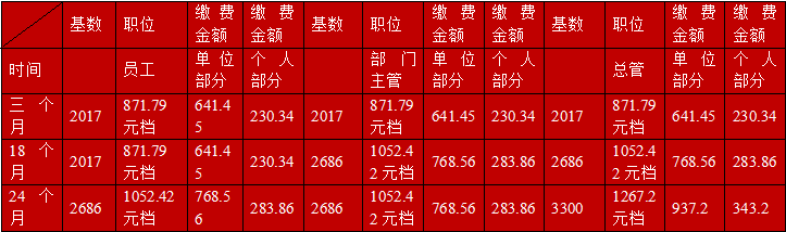 自2016年6月起社保单位缴费标准调整:养老保险基数为2017、医疗保险基数为2874。经公司领导研究决定统一调整单位员工社保比例,具体调整: